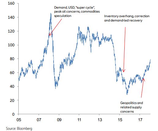 This paper attempts to rationalize recent oil price strength and perspectives for the remainder of the year. Post-trough recovery and demand-led strength have been substituted by geopolitics as prime oil price driver since early Q2 18