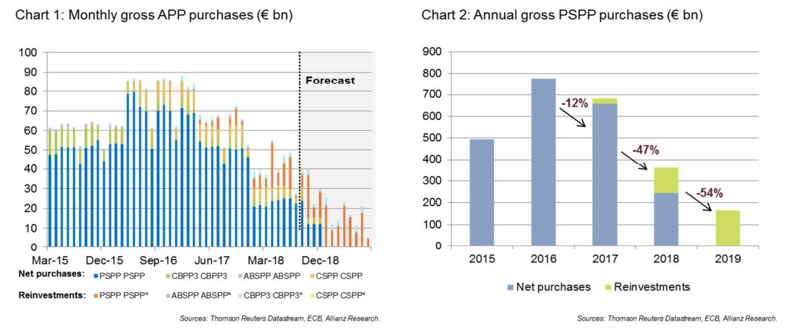 Whereas net purchases will stop next year, thanks to the reinvestment policy bonds bought under the PSPP program remain on the ECB’s balance sheet for an extended period of time. As maturing principal is reinvested – about €165 billion in total for 2019 – the overall size of the ECB’s Public Sector Purchasing Program (PSPP) portfolio remains constant in euro amounts for as long as the reinvestment policy is fully in place.