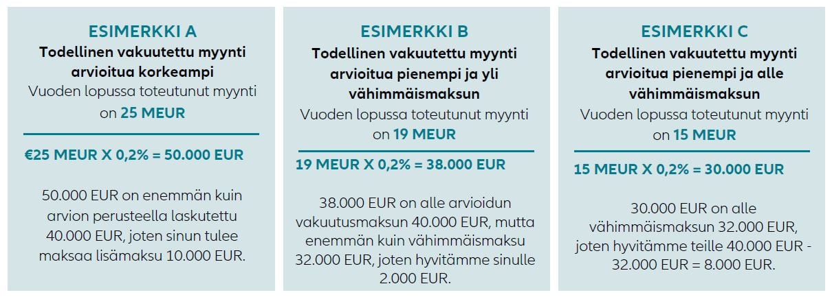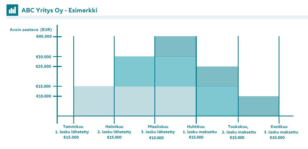 Esimerkki keskimääräisen avoimen saldon laskemisesta säännölliselle myynnille. Käyt kauppaa yrityksen ABC Yritys Oy:n kanssa. Vuotuinen myynti heille on 60.000 EUR, laskutat säännöllisesti ja maksuehto on 30 pv. Yllä olevan laskelman mukaisesti keskimääräinen avoin saldo on (60.000 EUR / 360) x 30 = 5.000 EUR.