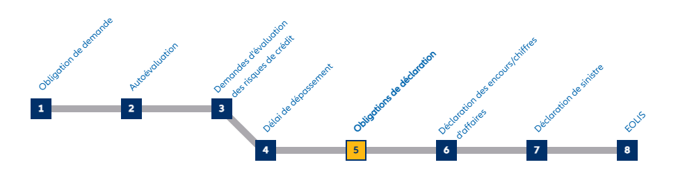 De façon générale, déclarez le retard de paiement pour tous les clients assurables ayant leur siège dans les pays couverts (cf. « police d’assurance »). À titre exceptionnel, certains clients ont été exclus de votre police. De même, les « petits clients » ayant un encours inférieur au seuil de non-dénommé contractuel ne doivent pas faire l’objet de la demande.