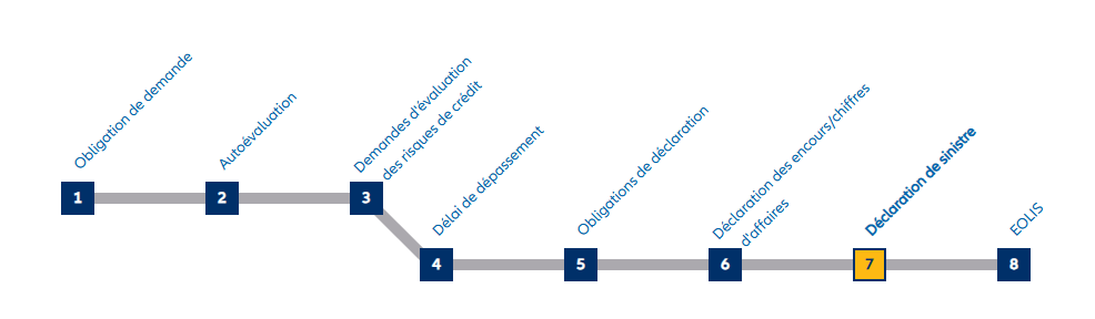 Vous trouverez dans votre police les délais dans lesquels il y a lieu d’effectuer une déclaration de sinistre. Le plus simple et le plus rapide est de nous déclarer un sinistre en ligne, via EOLIS . Sur EOLIS vous pouvez également joindre en annexe tous les documents requis. En cas d’insolvabilité, veuillez nous déclarer immédiatement vos créances impayées.