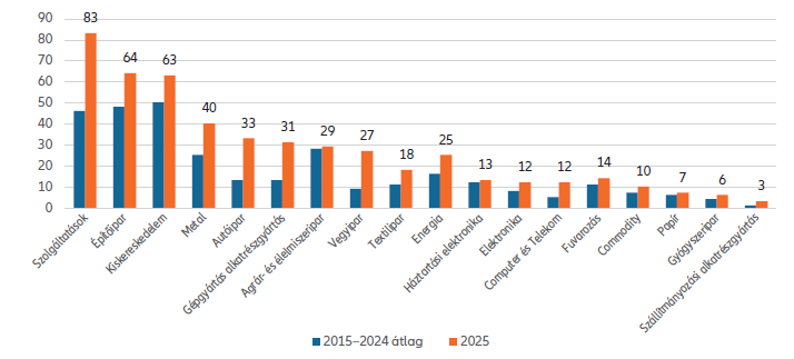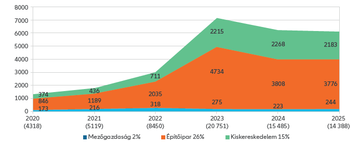 A magyar felszámolási eljárások szerkezete különösen beszédes: a hazai felszámolások 26%-a építőipari vállalkozásokhoz köthető, vagyis messze ez az ágazat a leginkább kitett a fizetésképtelenségi kockázatoknak.