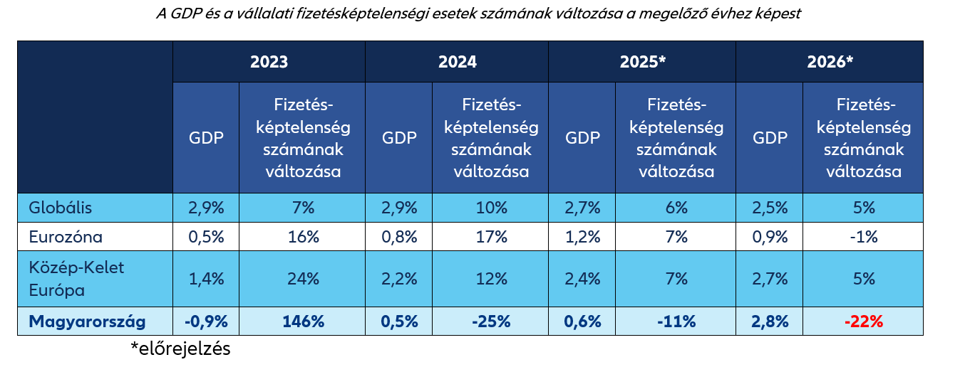 - Hazánkban 2025-ben a lakossági hitelezés élénkül, ugyanakkor a vállalati hitelfelvétel stagnál, éves növekedése körülbelül 2 százalék körül alakul. A gyenge növekedés következménye, hogy a vállalatok növekedésük finanszírozására egyre inkább az „ingyenes” szállítói hitelt használják, hosszabb fizetési határidőkkel és emelkedő késedelmekkel. Ez a hitelbiztosítók kockázatát emeli, hiszen ha a fizető nem teljesít, a biztosító vállalja az ebből eredő kártérítést.