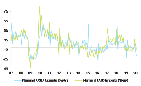 Tempo wzrostu chińskiego handlu w pierwszych dwóch miesiącach 2020 r. było najniższe od 2016 r. Spadek ten jest mimo wszystko niewielki w porównaniu z 2009 r., kiedy to eksport i import obniżyły się odpowiednio do -26.5% i -43.1% r./r w ciągu jednego miesiąca. W styczniu i lutym 2020 r. , eksport i spadły odpowiednio o -17.2% i -4.0% y/y (zob. Rysunek 1). Spadek eksportu był większy niż przewidywano i oznacza najsłabszy początek roku od 2016 r. W najbliższych miesiącach może dojść do dalszego pogorszenia sytuacji w handlu, gdyż środki zapobiegania rozprzestrzenianiu się epidemii na świecie działają jako główna bariera handlowa (zob. tutaj).