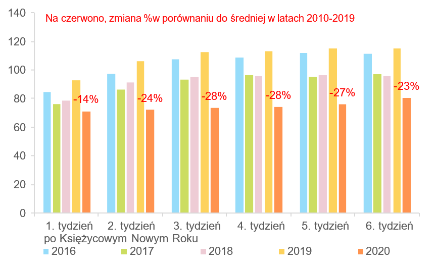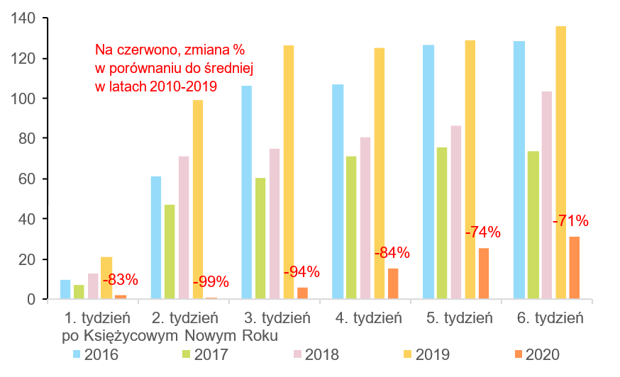 Szacujemy, że środki zapobiegania rozprzestrzenianiu się epidemii w Chinach prawdopodobnie będą kosztować -3 p.p. wzrostu PKB Chin w I kw. r./r., w tym -1,8 p.p. ze względu na niższą konsumpcję prywatną. Drastyczne środki wciąż stosowane w prowincji Hubei (która odpowiada około 4,5% PKB Chin) wraz z ogólną ostrożnością i ograniczeniem kontaktów między ludźmi w pozostałej części Chin wpływają na konsumpcję gospodarstw domowych, zwłaszcza na wydatki nieobowiązkowe, o charakterze uznaniowym. Odbudowa ufności konsumenckiej i powrót ich wydatków do normalnego poziomu może zająć więcej czasu niż przywrócenie produkcji. Wciąż wolumen transakcji na rynku nieruchomości pozostaje około 70% poniżej zwykłego poziomu, jaki notowano o tej porze roku (oryg.: „w szóstym tygodniu po Księżycowym Nowym Roku”) (zob. Rysunek 2).