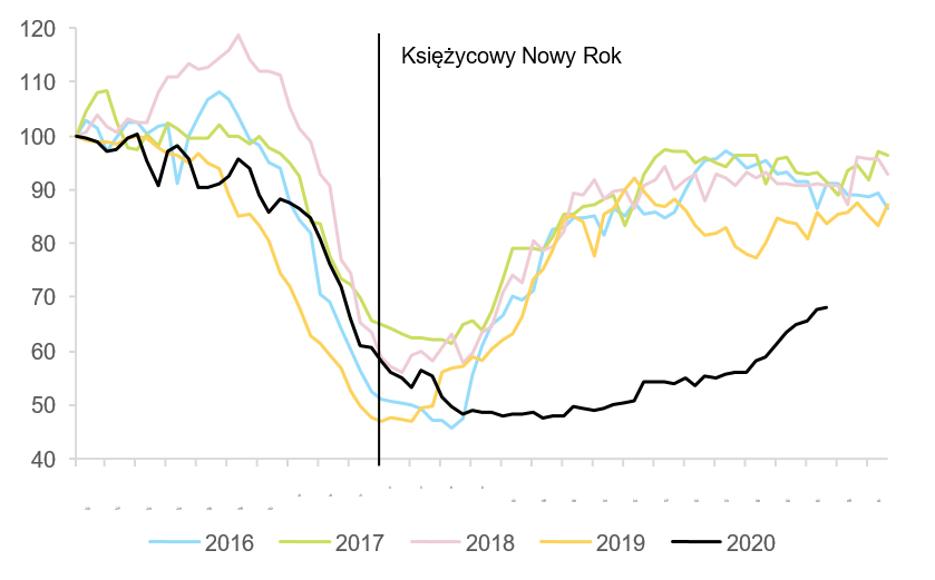 Rysunek 3 – Wskaźnik zatorów drogowych (100 głównych miast), baza 100 = 30 dni przed Księżycowym Nowym Rokiem