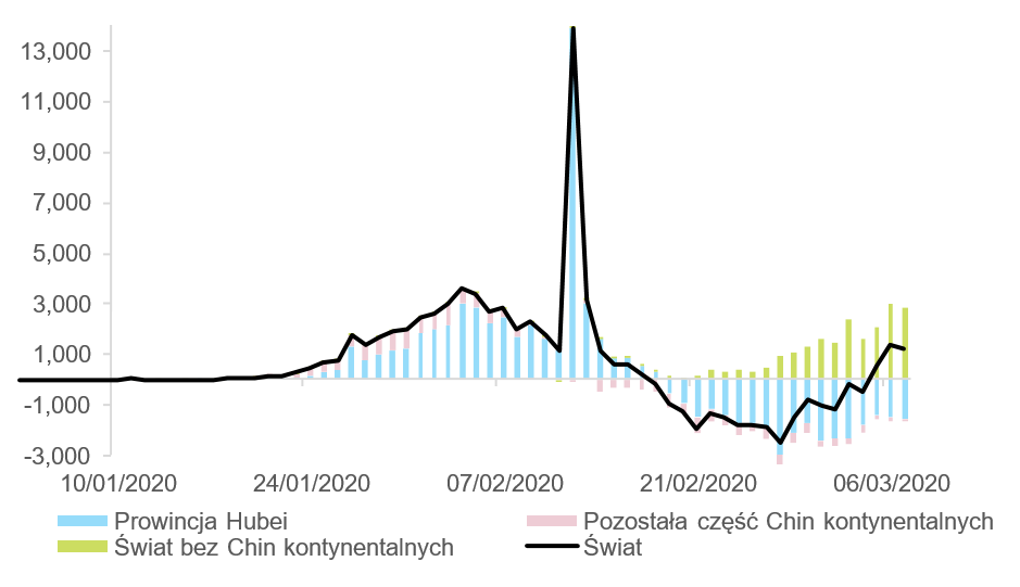 Oczekujemy, iż powrót chińskiej gospodarki do działalności w pełnym zakresie, na zwyczajowym poziomie produkcji i obrotów nastąpi do końca kwietnia. Władze będą uruchomiać gospodarkę stopniowo w celu ograniczenia ryzyka ponownego wzrostu zarażeń COVID-19, wraz z powrotem migrujących pracowników do swoich miejsc pracy, i wraz z pogorszeniem się epidemii w innych częściach świata (zob. Rysunek 5). Według stanu na dzień 5 marca, chińskie władze potwierdziły 36 przypadków wirusa COVID-19 przywiezionego z zagranicy, tj. około 40% nowych przypadków w ciągu dziesięciu w całych Chinach z wyłączeniem prowincji Hubei.