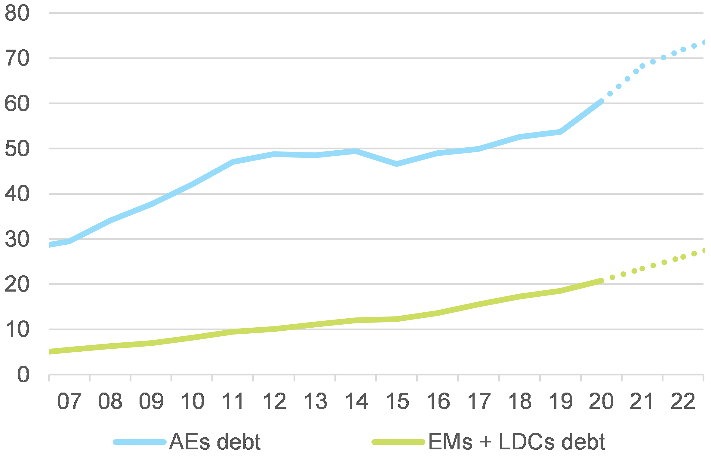 A crise da Covid-19 desencadeou um aumento sem precedentes da dívida pública no mundo inteiro. O montante já vinha aumentando no pré-crise devido à queda dos preços das commodities em 2015 e à fraca dinâmica de crescimento na maioria das Economias Avançadas (EAs, ver Figura 1). A relação dívida/PIB global aumentou de 60% em 2007, para 83% em 2019. No ano passado, com os gastos relacionados à pandemia e o esgotamento das receitas estrangeiras, a relação saltou para 96%. Comparando a dívida pública mediana entre as diferentes classes de países, descobrimos que os Mercados Emergentes (MEs) quase alcançaram a proporção de 67% das EAs em 2020. Quanto aos Países em Desenvolvimento (PEDs) - que estruturalmente têm maior intolerância à dívida - o rácio subiu para 46% (ver Figura 2).