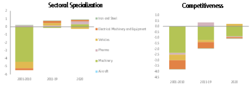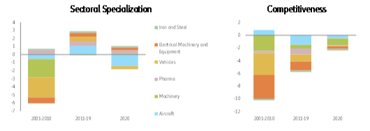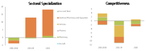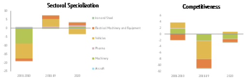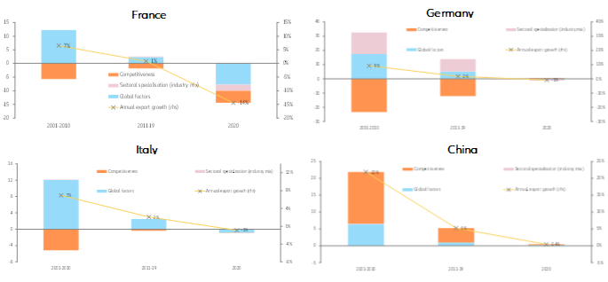 Já na Alemanha, descobrimos que a especialização setorial impulsionou o desempenho das exportações entre 2001 e 2019, enquanto em 2020 essa contribuição tornou-se neutra (ver Figura 2). A análise setorial mostra que os setores de veículos e máquinas e equipamentos elétricos se beneficiaram especialmente da forte dinâmica de crescimento em todo o mundo. Apenas esses dois setores combinados já representavam mais de 25% do total das exportações alemãs de bens entre 2011 e 2019. Por outro lado, a crescente participação da China nesses setores foram más notícias para a Alemanha. Eentre 2001 e 2019, a Alemanha teve um desempenho inferior aos seus pares globais nos setores altamente dinâmicos: em máquinas e máquinas; e equipamentos elétricos em particular, os exportadores alemães parecem ter sofrido com a fraca competitividade (preço) em relação à China.