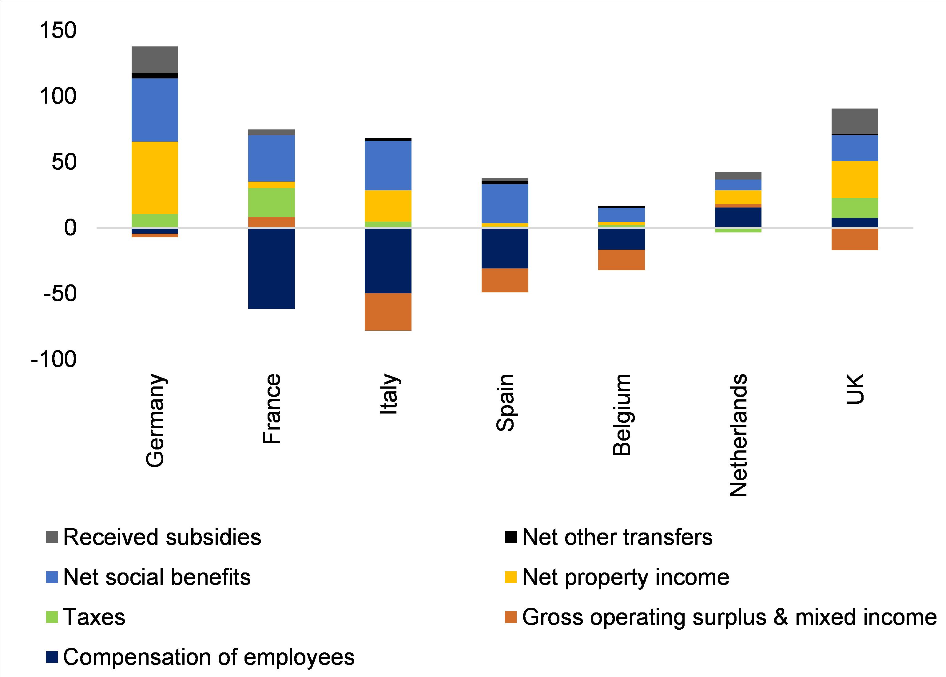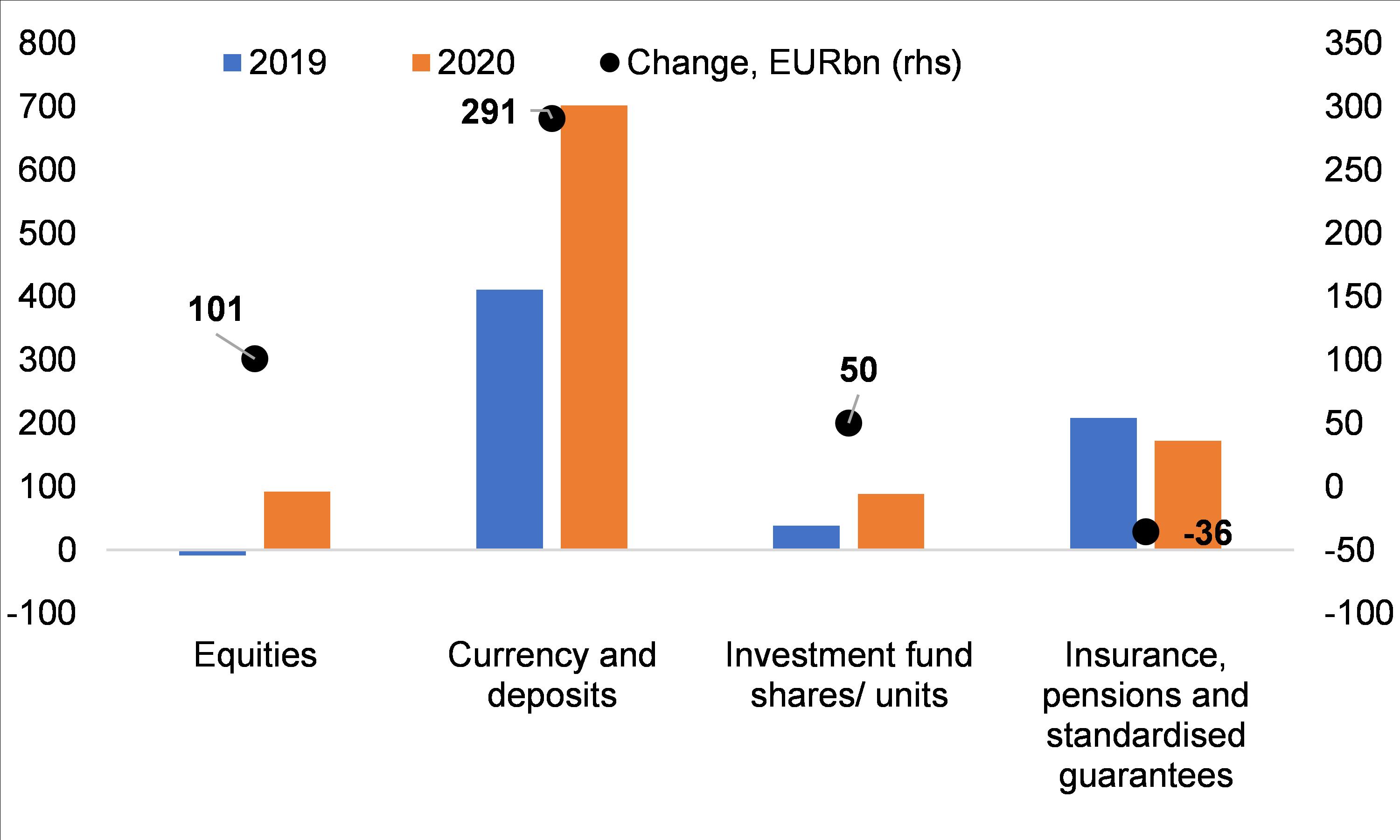 Em 2020, a poupança bruta na zona do euro aumentou mais de +50%, e a “poupança excedente” ficou em mais de EUR450 bilhões, ou mais de 4% do PIB - graças aos gastos reduzidos com serviços em meio ao lockdown. As medidas de apoio estatal também desempenharam um papel importante. Junto com esquemas de desemprego parcial, tributação mais baixa e subsídios mais elevados, apoiaram a renda disponível bruta, que permaneceu estável em 2020 (ver Figura 2). No geral, o excesso de poupança a partir de 2020 representa quase um mês do rendimento disponível bruto de 2019. Dois terços dos ativos financeiros excedentes das famílias acabaram em contas bancárias, enquanto o terço restante foi investido em mercados de capitais - principalmente em ações. Em 2020, as famílias europeias passaram de vendedores líquidos de ações para compradores líquidos (ver Figura 3), com a maior parcela vista na Alemanha (27%) e Itália (21%), contra 15% na França e 8% na Espanha. Em todos os países, no entanto, a participação diretamente investida em ações está significativamente acima dos níveis dos anos anteriores, indicando um novo interesse em ativos financeiros de risco.