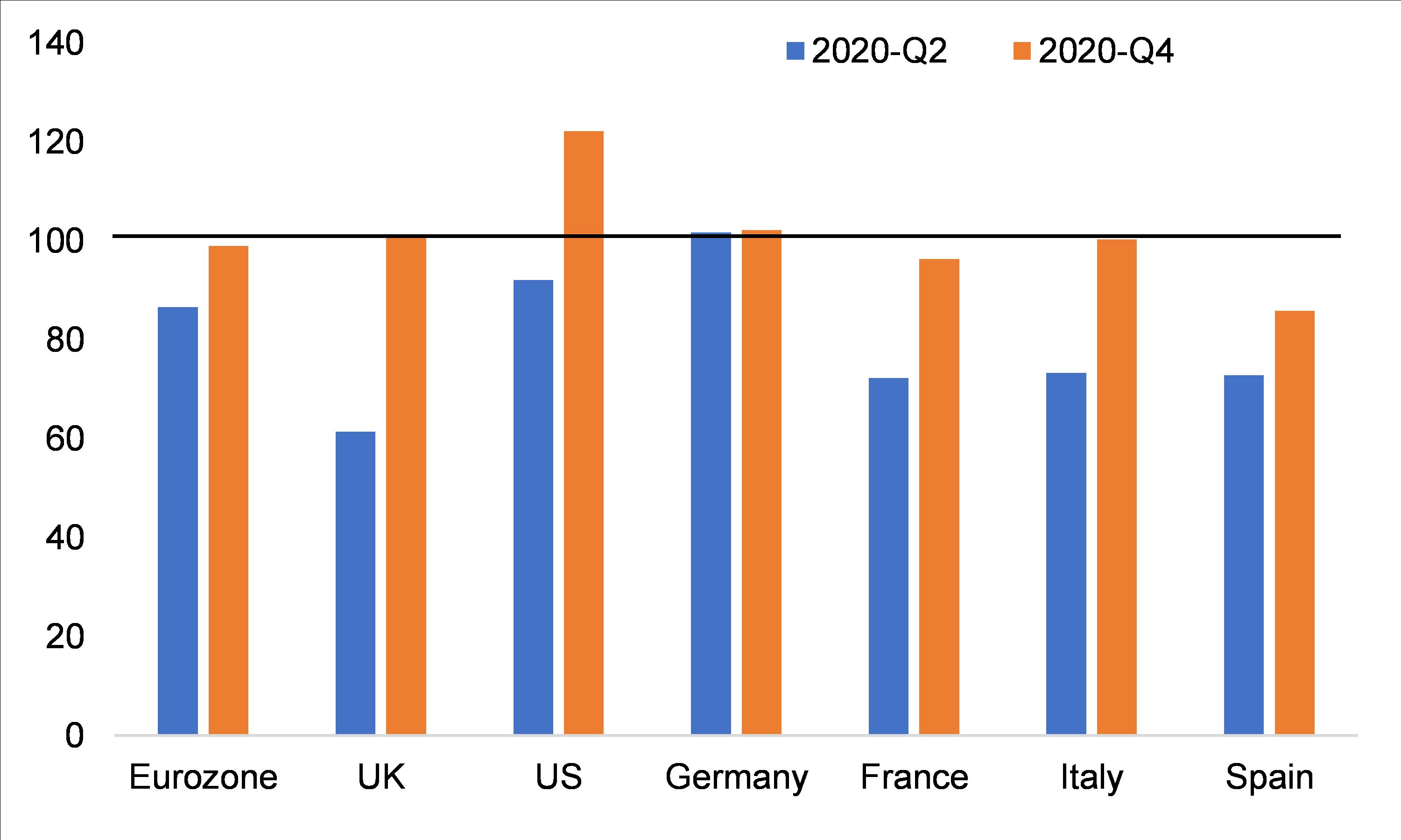 Em 2021, o excesso de poupança das famílias poderá gerar um dividendo duplo para a Zona do Euro. O primeiro: um boom no consumo equivalente a 170 bilhões de euros (ou 1,5% do PIB). O segundo: aceleração da transformação verde e digital da economia europeia.
