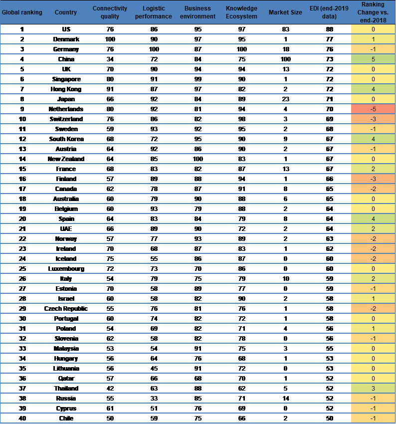 Os dados também mostram que outras nações asiáticas fizeram progresso: Hong Kong, agora na 7ª posição, anteriormente na 11ª. Coréia do Sul, na 12ª posição acima da 16ª posição. Seis dos 15 principais viabilizadores digitais estavam na região Ásia-Pacífico no final de 2019. Outras progressões notáveis incluem o Vietnã de 67ª para 57ª e a Arábia Saudita de 53ª para 41ª, confirmando uma clara vontade de transição para um novo modelo de crescimento.