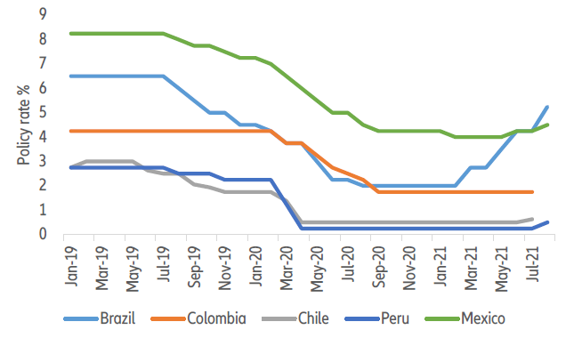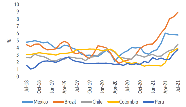 A aceleração foi especialmente acentuada no Brasil, México e Colômbia, embora em torno de 4% em julho de 2021. Como resultado, os bancos centrais latino-americanos, especialmente no Brasil, foram alguns dos primeiros nas economias emergentes a aumentar as taxas de juros, e esperamos novos aumentos antes do final do ano. Custos de empréstimos mais altos colocarão ainda mais pressão sobre as finanças públicas já deterioradas em alguns países. As respostas fiscais à pandemia foram heterogêneas na América Latina, com, por exemplo, um estímulo substancial no Brasil ampliando o déficit para -13,4% do PIB, enquanto a abordagem conservadora do México conteve o déficit em -4,6% do PIB. Como resultado, os caminhos para retornar às posições fiscais pré-pandêmica serão substancialmente divergentes e os custos crescentes dos empréstimos colocarão pressão sobre os países com déficits mais amplos, pois eles terão que escolher entre consolidar ou deteriorar a dinâmica da dívida pública. Essa questão pesará principalmente em países como Brasil, Argentina e, em menor medida, Colômbia e México, que já enfrentavam níveis mais elevados de dívida pública antes do choque.