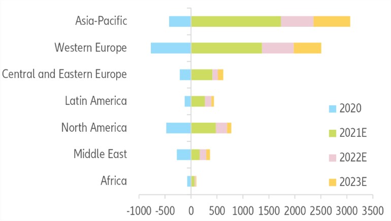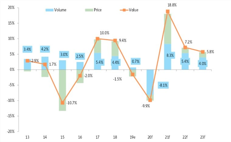 Esperamos que em 2021, o comércio global cresça +8,1%, em volume, e 18,8%, em valor, impulsionado pela escassez de insumos e um dólar forte que aumenta os efeitos de preço. Para 2022 e 2023, acreditamos que essa tendência se reverta e estimamos um crescimento na casa de +5,4% e +4,0%, respectivamente, em termos de volume, e +7,2% e 5,8%, em termos de valor.