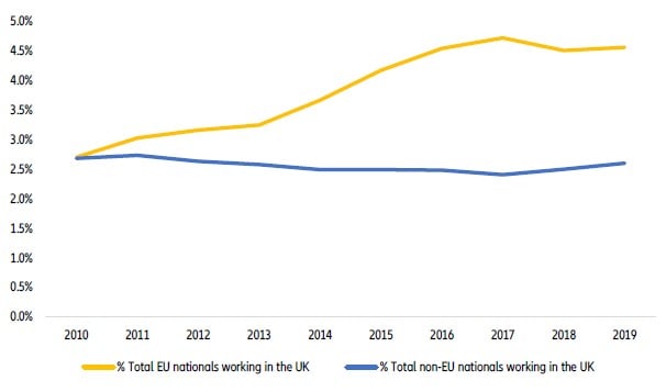 Figura 01: Total de cidadãos da UE e de outros países que trabalham no Reino Unido, % da população ativa
