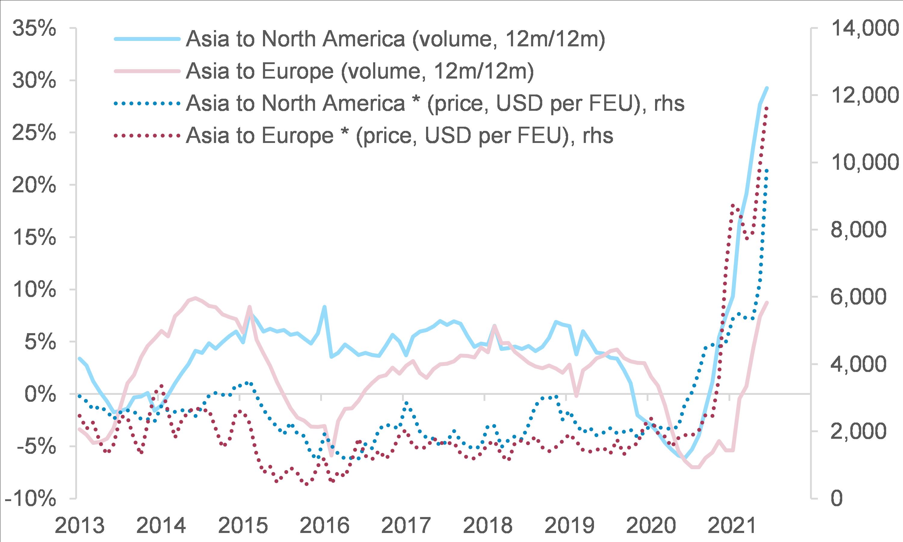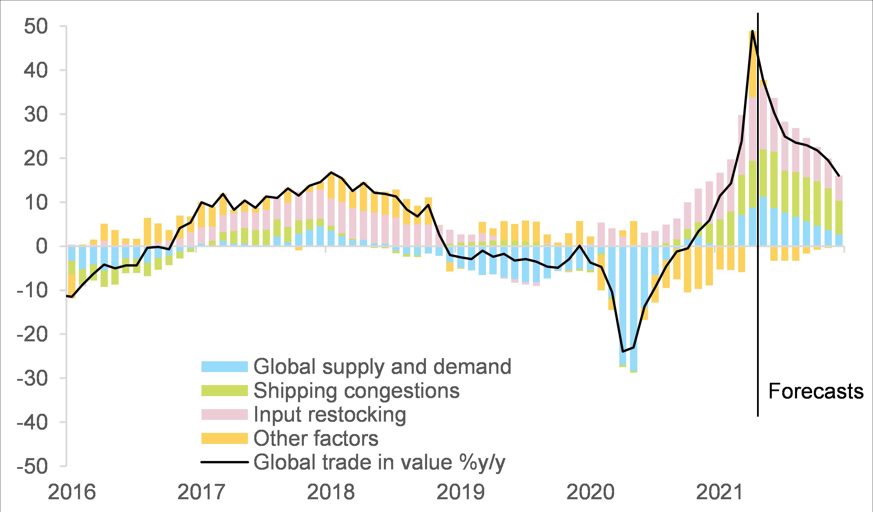 O comércio global se recuperou mais rápido e mais forte do que o esperado no primeiro trimestre de 2021. Em termos de valor o crescimento foi de +8,6% t/t e em volume +3,4% t/t, ambos impulsionados por pressões de preço e capacidade. É provável que esse ritmo continue em 2022. Embora a oferta e a demanda global tenham explicado a maior parte da contração do ano passado, essas variáveis representam apenas c.15% do crescimento apresentado até agora (ver Figura 1). Em vez disso, o fator que está carregando o resultado para cima é o reabastecimento de matéria prima, totalizando cerca de 50% do aumento. Mais especificamente, dirigido pelas empresas americanas e europeias que estão reabastecendo os estoques com insumos para responder a uma forte recuperação na demanda local.