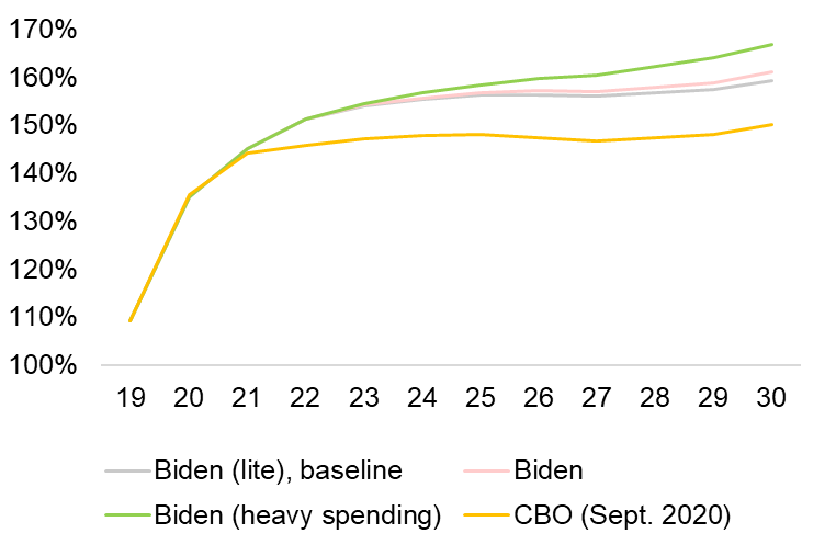 Figura 1: Dívida pública dos EUA em % do PIB no horizonte de 2030 como resultado da execução da plataforma econômica de Biden