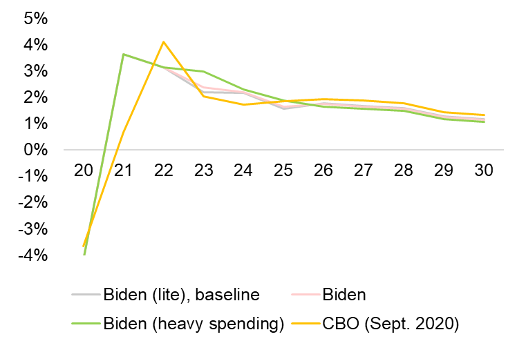 Consequências de curto e longo prazo para o crescimento: em suma, a execução completa da plataforma econômica de Biden, que equivale a injetar um estímulo líquido adicional de USD 2,7 trilhões na economia, poderia levar a dívida pública dos EUA a atingir 159-167% no horizonte de 2030, em comparação com 135% em 2020. Consequentemente, ao estimar o crescimento potencial de longo prazo da economia dos Estados Unidos em função de quatro variáveis diferentes: produtividade, crescimento anual da população ativa, importações e dívida pública, prevemos uma queda provável de +2% para +1,4 % no horizonte de 2030.