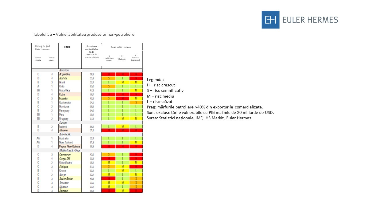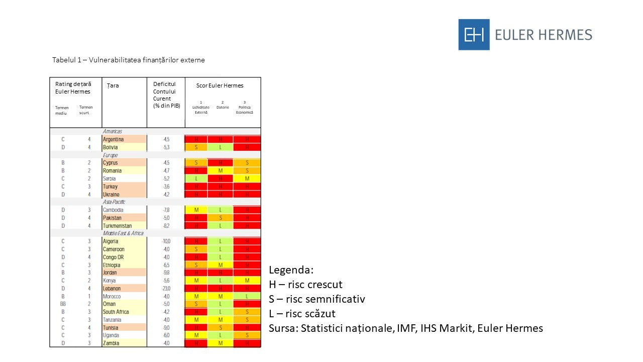Această analiză scoate în evidență economiile care, în opinia Euler Hermes, ar putea fi afectate cel mai mult de înăsprirea bruscă a condițiilor de finanțare externe, de absența unei ajustări adecvate a politicilor și/sau de pierderea cererii de export. Acesta indică, de asemenea, că economiile mai vulnerabile ar trebui să scadă prețurile materiilor prime în mod neașteptat.