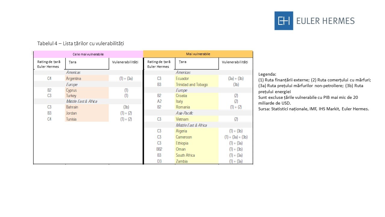Vulnerabilitățile la o încetinire economică globală există clar, iar această analiză evidențiază acele economii care ar putea fi afectate cel mai serios de o recesiune relativ puternică sau bruscă, dacă nu au politici corective adecvate. Rezumând pe cele trei canale principale și excluzând acele țări care se află deja în categoria celor mai defavorizate țări (D4) în raportul Euler Hermes, am stabilit șase țări ca fiind "cele mai vulnerabile" la o încetinire globală: Argentina, Cipru, Turcia, Bahrain, Iordania și Tunisia (vezi tabelul 4). Mai mult, alte 12 țări au fost identificate ca fiind "mai vulnerabile" și ar necesita o monitorizare atentă în cazul în care încetinirea globală se va dovedi deosebit de puternică. Acest al doilea grup include câteva economii mai mari, cum ar fi Italia, România, Croația, Africa de Sud, Algeria, Oman și Vietnam (Tabelul 4: Lista țărilor mai vulnerabile la o încetinire globală).