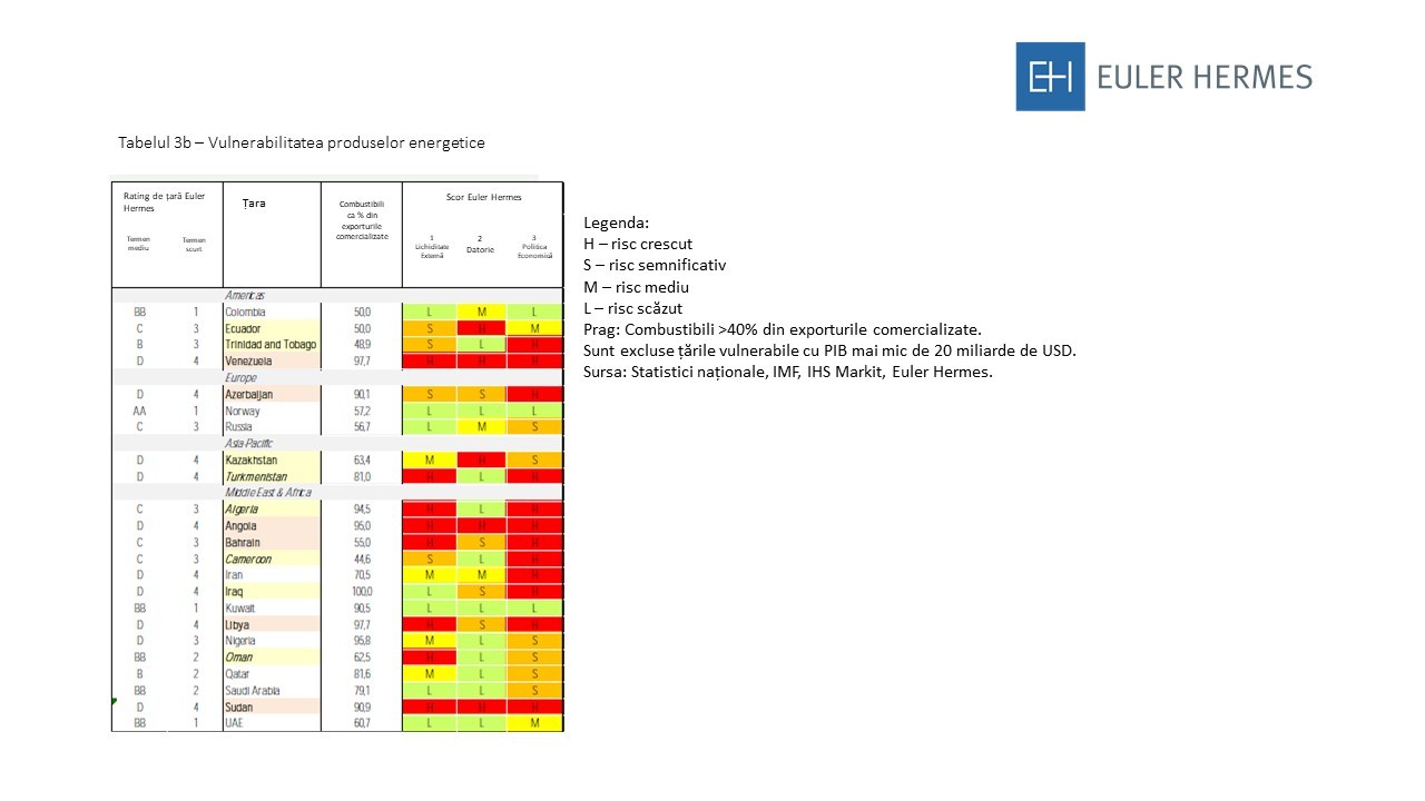Prețul energiei Tabelul 3b identifică 23 de producători de energie și dependența lor de exporturile de energie. În acest moment, Euler Hermes nu se așteaptă la un colaps al prețurilor la energie, deși s-au redus recent. Cu toate acestea, în cazul în care încetinirea globală se dovedește a fi mai puternică decât prognoza curentă, prețurile ar putea scădea în mod neașteptat. În acest caz, toți producătorii de energie ar suferi o decelerare a creșterii, iar unii probabil o recesiune. Câteva dintre aceștia s-ar putea confrunta cu o scădere a ratingului lor pe termen scurt ca urmare a recesiunii ciclice. (vezi Tabelul 3b: Vulnerabilitatea producătorilor de energie selectați).