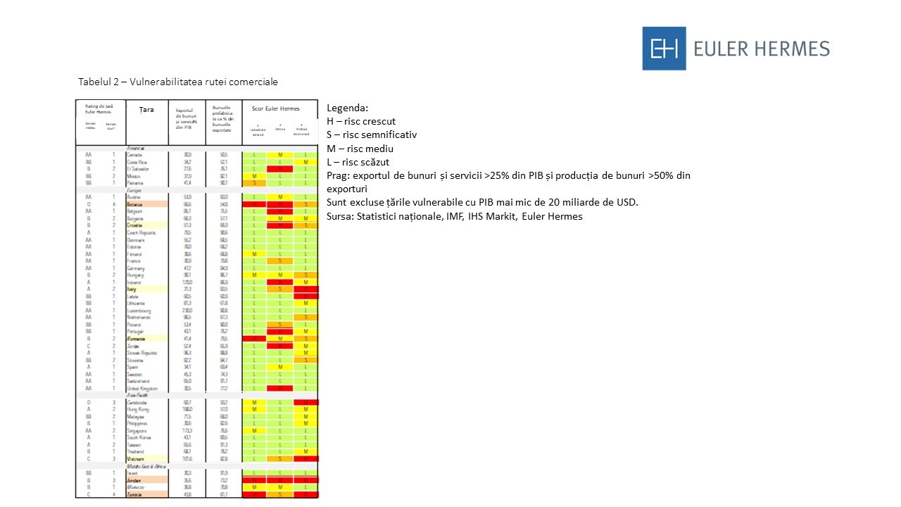 Cel mai puternic efect este de-a lungul rutei comerciale. Comerțul cu mărfuri poate fi împărțit în linii mari în comerțul cu bunuri și comerțul cu servicii. Această secțiune va identifica țările cu un PIB mai mare de 20 miliarde USD, care sunt mai vulnerabile la impactul încetinirii globale a comerțului cu bunuri prelucrate. Există, de asemenea, un comerț considerabil și important cu servicii, în special cu turismul. Încasările din servicii sunt luate în considerare de Euler Hermes și, prin urmare, se reflectă în capacitatea de a face față unei recesiuni. Tabelul 2 identifică 45 de economii cu un PIB mai mare de 20 miliarde USD, precum și un raport ridicat al exporturilor de bunuri și servicii cu PIB (> 25%) și mărfurile fabricate în totalul exporturilor de mărfuri (> 50%), ca fiind cele mai expuse la o scădere globală. Este probabil ca aceste țări, inclusiv multe economii avansate, să înregistreze o încetinire puternică (în raport cu ratele lor de creștere recente), în special în absența politicilor de compensare. Unii dintre ei pot chiar să observe o scădere a ratingului lor pe termen scurt ca urmare a creșterii riscului ciclic.