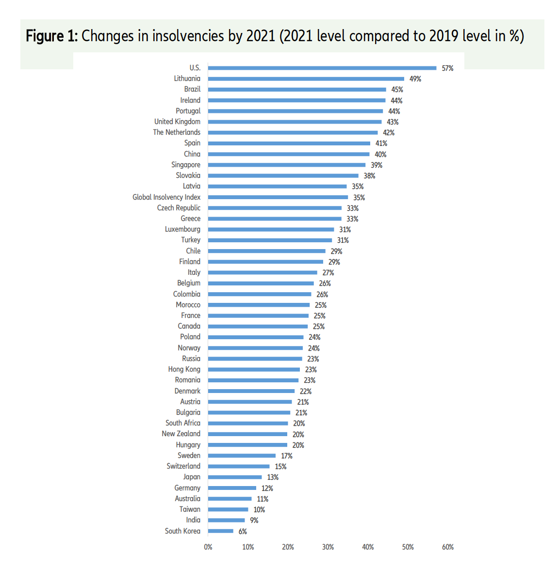 Najvyšší nárast insolvencií zaznamená USA (v nasledujúcom roku +57% v porovnaní s rokom 2019), ďalej Brazília (+45%), Čína (+20%) a kľúčové európske krajiny ako Veľká Británia (+43%), Španielsko (+41%), Taliansko (+27%), Belgicko (+26%) a Francúzsko (+25%). Predpokladá sa, že 2 z 3 krajín tento rok vykážu vyšší nárast insolvencií ako v budúcom roku - pôjde najmä o USA, Brazíliu, Čínu, Španielsko a Taliansko. V roku 2021 zaznamená len 1 z 3 krajín zrýchlenie ekonomiky - a to najmä India, Veľká Británia, Francúzsko a v menšom rozsahu aj Nemecko.