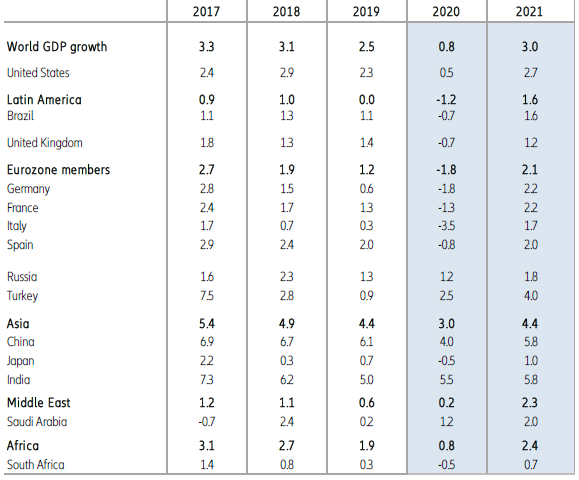 Základná línia vývoja bude nasledujúca: Vážna recesia v roku 2020 a zotavenie v tvare U v roku 2021. Odborníci Allianz Trade tvrdia, že svet zažije v prvom polroku 2020 prudkú recesiu, a odhad globálneho rastu HDP do roku 2020 by mohol byť na úrovni +0,8%. Odborníci očakávajú rast HDP v USA +0,5% a pokles HDP v eurozóne -1,8%.