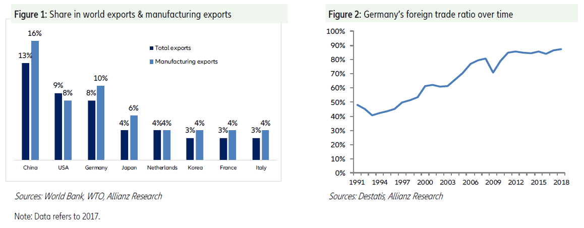 Vývozná závislosť Nemcov sa v súčasnosti ukazuje byť ich najväčšou Achillovou pätou. Je to výsledok kombinácie celkovo slabého svetového obchodu a rozmanitosti negatívnych rizík, ktorá ovplyvňuje ďalší výhľad, tiež obchodný konflikt medzi USA a Čínou a riziká Brexitu.