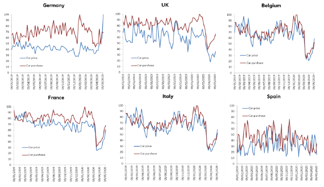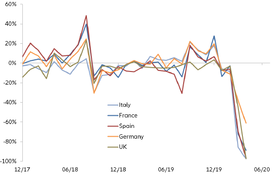 Podľa údajov jednotlivých národných ekonomík zverejnených začiatkom mája, klesol počet registrácií nových áut v Nemecku v apríli medziročne o 61%, vo Francúzsku o 89%, v Španielsku, v Spojenom kráľovstve o 97% a v Taliansku až o 98%. Od začiatku tohto roka do konca apríla poklesol automobilový trh v Nemecku o 31%, v Spojenom kráľovstve o 43%, vo Francúzsku o 48%, v Španielsku o 49% a v Taliansku o 51%.