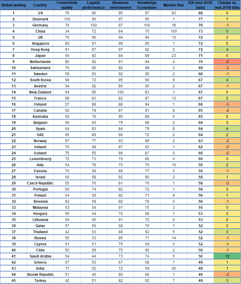 Na prvých troch priečkach indexu EDI 2020 sa umiestnili USA, Dánsko a Nemecko. Spojené štáty sú na čele vďaka výbornému ekosystému vzdelávania, veľkosti trhu a priaznivej regulácii. Nemecko sa môže pochváliť najlepším ekosystémom vzdelávania, ako aj úrovňou infraštruktúry. Dánsko zase zaznamenalo najlepší výsledok v oblasti kvality pripojenia.
