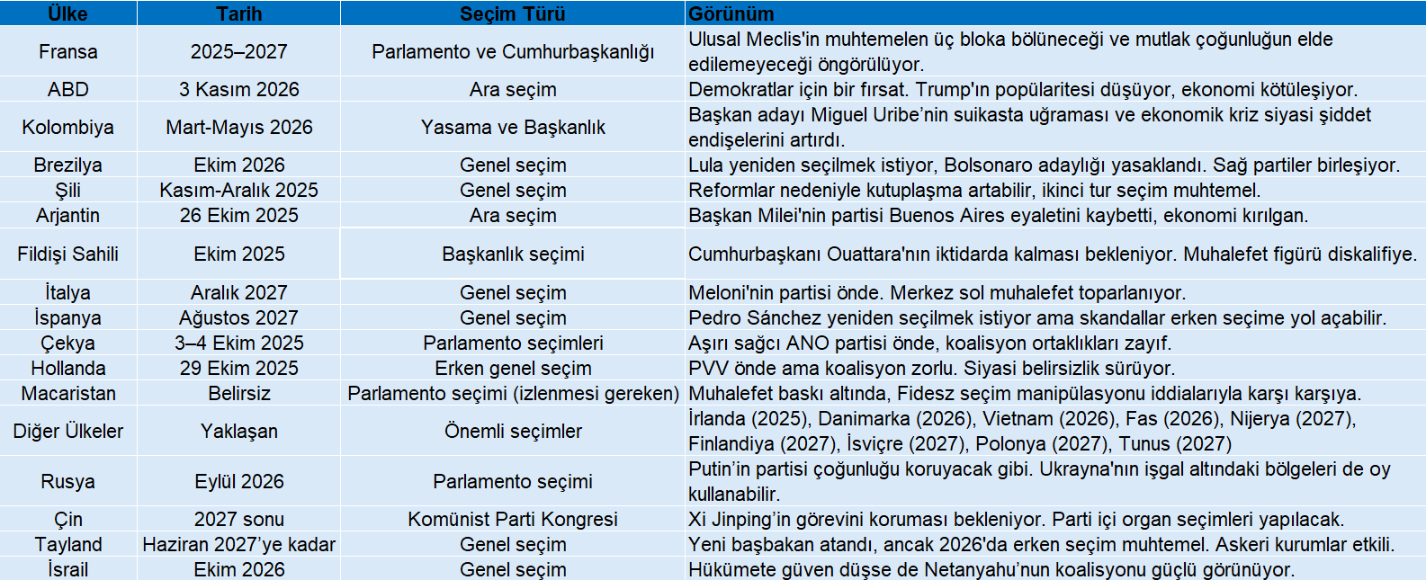 Kısmen şimdiye kadar destekleyici dış talep sayesinde gelişmekte olan piyasalar genel olarak - hâlâ genişleme döngüsünde. Asya'daki ihracatçılar ABD'de pazar paylarını artırdı. Tayvan, Vietnam, Tayland ve Endonezya gibi ülkeler yedek üretim kapasitelerini dahi korudu. Enflasyonun kontrol altına alınması ve ABD dolarının değer kaybetmesiyle de birlikte ekonomik görünümün daha karamsar hale gelmesi üzerine çoğu gelişmekte olan ülkede merkez bankaları politika faiz indirimlerini hızlandırdı. Bu döngünün 2026 ortasına kadar yavaşlamasını bekliyoruz. Gelişmekte olan ülkelerin yarısından fazlasında maliye politikalarında da gevşemeye gidildi. Piyasalar şu aşamada endişeli görünüyor olsa da değerlemelere yönelik giderek artan bir endişe var ve Arjantin, Brezilya, Mısır, Endonezya gibi bazı ülkeler yakından izlenmeli. Latin Amerika ve Orta ve Doğu Avrupa'nın çoğu ve Güneydoğu Asya ve Afrika'nın bir kısmı da cari açıkları olan net borçlular olarak riskten kaçınma eğilimine karşı savunmasız. Çin ekonomisinde büyüme, ihracatın daralması ve iç talebin hâlâ zayıf olması nedeniyle 2026'ya kadar yavaşlayacaktır. Bu bağlamda özel sektörün güvenini yeniden tesis etmek ve deflasyonist baskıları kontrol altına almak – ki 2026'nın ilk çeyreğine kadar ilave politika desteği sağlanması muhtemel – ülke için başa çıkılması gereken zorlukların başında geliyor.