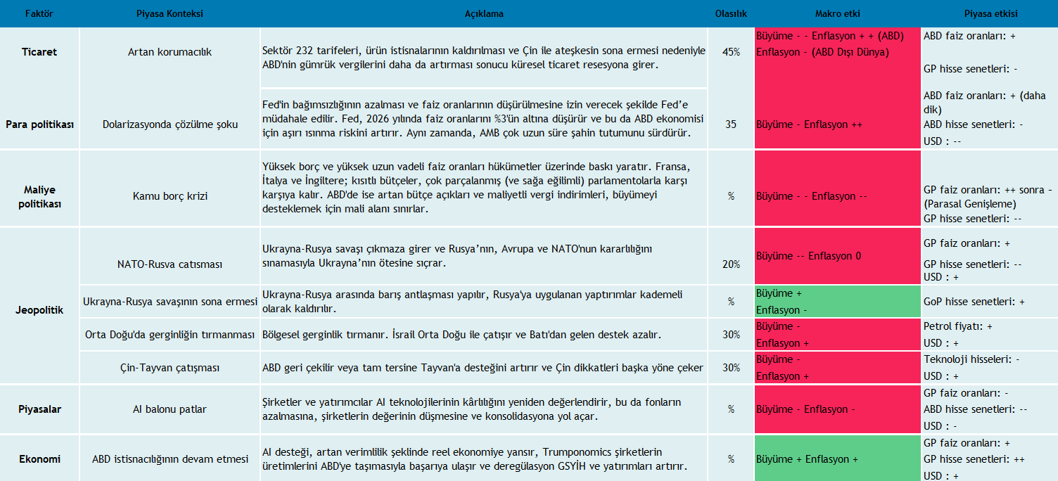 Yüzde45 olasılıkla artan korumacılık, ABD'nin gümrük vergilerini artırmasıyla küresel ticarette durgunluğa yol açabilir ve bu da büyüme ve enflasyonu olumsuz etkilerken, gelişmiş piyasalardaki faiz oranları ve hisse senetleri üzerinde baskı yaratabilir. Öte yandan, yüzde 35 olasılıkla gerçekleşebilecek bir dolarizasyon çözülmesi politikası şoku, EURUSD paritesini 1,25'in üzerine çıkarabilir. Yüzde 20 olasılıkla gerçekleşebilecek bir kamu borç krizi, yüksek borç seviyeleri ve faiz oranları nedeniyle Fransa, İtalya, İngiltere ve ABD'de maliye politikalarını kısıtlayabilir. Jeopolitik gerilimler daha da artabilir; NATO-Rusya çatışması, Orta Doğu'daki gerilimlerde bir tırmanma ve Çin ile Tayvan arasında açık çatışma potansiyel riskler olarak öne çıkıyor. Yukarı yönlü riskler arasında ise şunlar sayılabilir; Ukrayna-Rusya ateşkesinin sağlanması ile büyümenin ve Avrupa sanayisinin canlanması, ABD'nin istisnacıduruşunun, yapay zeka alanındaki gelişmeler ve Trumponomics'in başarısı yoluyla ekonomik büyümeyi tetiklemesi ve gelişmiş piyasalardaki hisse senetlerine olumlu etkiler yapması.