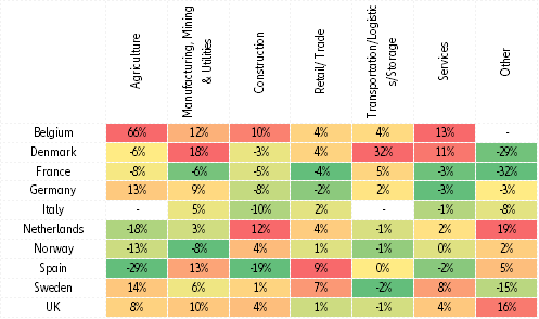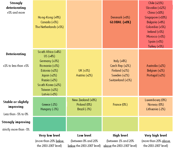 2020 yılında her beş ülkeden dördünde iflaslarda artış olmasını bekliyoruz (karşılaştırmak gerekirse, 2019 yılında her 3 ülkeden 2’sinde artış olmuştu). Aynı zamanda, her iki ülkeden birinin 2003-2007 dönemi ortalamasına göre (2008 finansal krizi öncesi dönem) daha fazla iflas kaydedeceğini öngörüyoruz. Son yıllarda yeni iş oluşumları bakımından dinamik bir tablo sergileyen ülkelerde -henüz zorluklar karşısında çok zayıf olan birçok yeni kurulmuş şirkete sahip olduğu için- iflaslarda daha fazla artış olması olası.