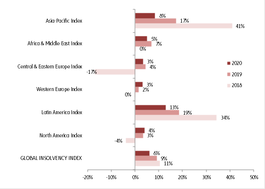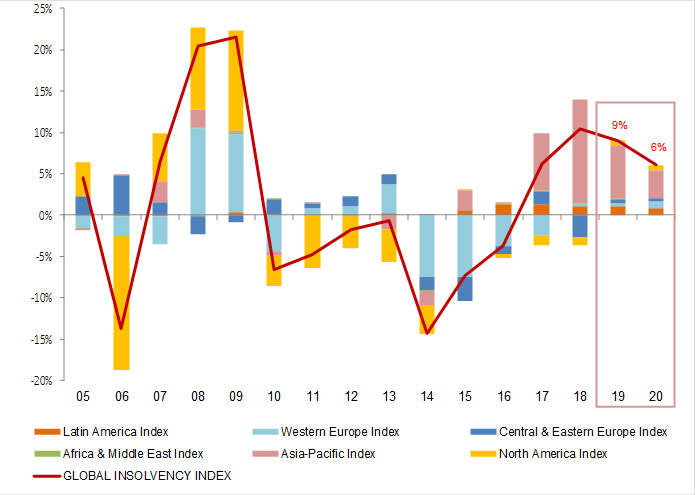 Makroekonomik faaliyetlerin temposunun düşük kalması ve siyasi olaylar ile ticari anlaşmazlıklara bağlı belirsizliklerin artması, 2019 yılında iflasların en önemli iki belirleyicisi oldu. Şirketler sadece daha zayıf bir küresel taleple değil, daha zayıf bir küresel ticaretle de (özellikle nominal mal ticaretine bakılacak olursa) karşı karşıya kaldılar ve bu durum, zaten ortada olan stok problemlerine (Brexit gibi örneklerde ihtiyati stoklamalardan yada otomotiv endüstrisinde olduğu gibi arz fazlasından kaynaklı) ek olarak küresel çapta imalat sanayii sektörünün zayıflamasına ve fiyat rekabetinin artmasına neden oldu. İflaslardaki artışın bir kısmı ise bazı ülkelerde yeni iflas prosedürlerinin uygulamaya sokulmasından ve resmi iflas prosedürleri kanalıyla ticaret sicillerinin silinmesinden kaynaklandı.