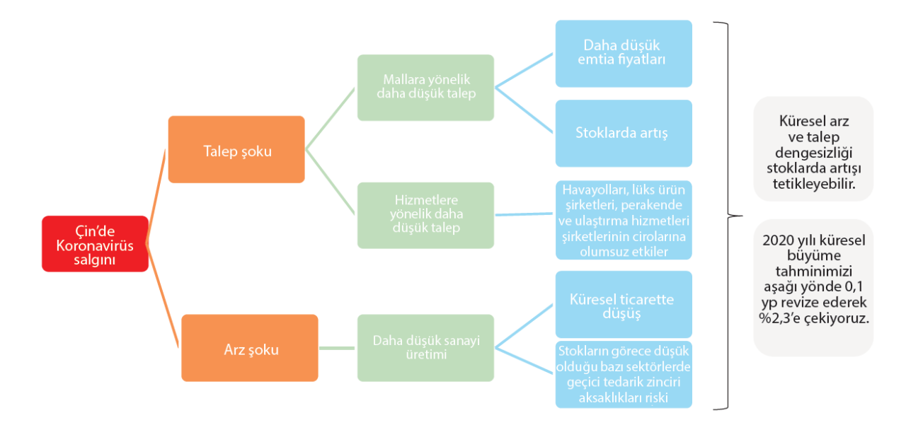 Son olarak, Çin’de iş faaliyetlerine yönelik aksaklıkların bir aydan fazla sürmemesi ve faaliyetlerin üç ay içinde olağan hale dönmesi durumunda salgının makroekonomik etkileri de sınırlı kalacaktır (2020 yılı ilk çeyreğinde küresel GSYH büyümesinde 0,3 yüzde puanlık düşüşle %2’lik artış şeklinde). Her ne kadar Koronavirüs salgınından dolayı ortaya çıkacak olumsuz etkilerin üç aydan uzun sürmeyeceğini düşünsek de, 2020 yılının ikinci yarısında küresel büyüme ABD kaynaklı belirsizlikler nedeniyle baskı altında kalacağından salgının yarattığı olumsuz etkilerin sonradan telafi edilmesi çok zor. Genel olarak baktığımızda, imalat sanayii sektörü ve küresel ticarette yaşanan resesyonun yılın ilk yarısına sarkacağını düşünüyoruz. Bu olaya bağlı olarak; Çin, Avrupa ve birçok ekonomi için (Hong Kong, Singapur, Güney Kore, Japonya, Tayvan, Tayland, Avusturalya) büyüme tahminlerimizde aşağı yönde revizyona gittik. Çin için aşağı yönde -0,3yp revize ettiğimiz yeni 2020 büyüme tahminimiz %5,6. Euro Bölgesi için ise -0,1yp ile %0,9. Bu revizyonlar ışığında 2020 yılı küresel GSYH büyüme tahminimizi de 0,1yp’lik aşağı yönde revizyonla %2,3’e çektik. Para politikalarının çok aktif kalmaya devam etmesini bekliyoruz çünkü Çin’in Koronavirüs nedeniyle izole edilmesinin mal ve hizmet ticareti üzerinde ciddi olumsuz etkileri olacaktır. Bu bağlamda, Avrupa Merkez Bankası ve Fed’in 2020 yılının ilk yarısında bir kez daha faiz indirimine gitme ihtimali arttı.